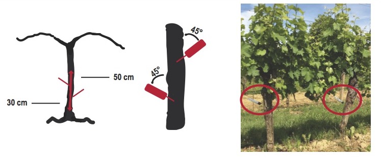 Trunchiul viței de vie se va găuri la 30-50 cm de la sol cu un burghiu de 30 mm la un unghi de 45°.Se va face cate o gaură pe fiecare parte iar diametrul găurii trebuie sa fie la fel de mare ca şi gâtul seringii care trebuie să fie fixat bine în trunchiul viței de vie.