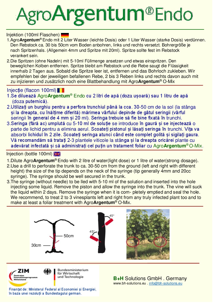 Se umple seringa (fară ac) cu 10 ml din materialul diluat , se îndepărtează pistonul culisant al seringii şi se va lăsa seringa in trunchi între 2 h şi 2 zile până când se asimileazâ tot conținutul. După ce seringa se goleşte ,pentru a evita pătrunderea apei de ploaie se va astupa gaura ( se recomandă siliconul). Se recomandă tratarea a 2-3 plante de viță de vie în dreapta cât şi în stânga fiecarei plante