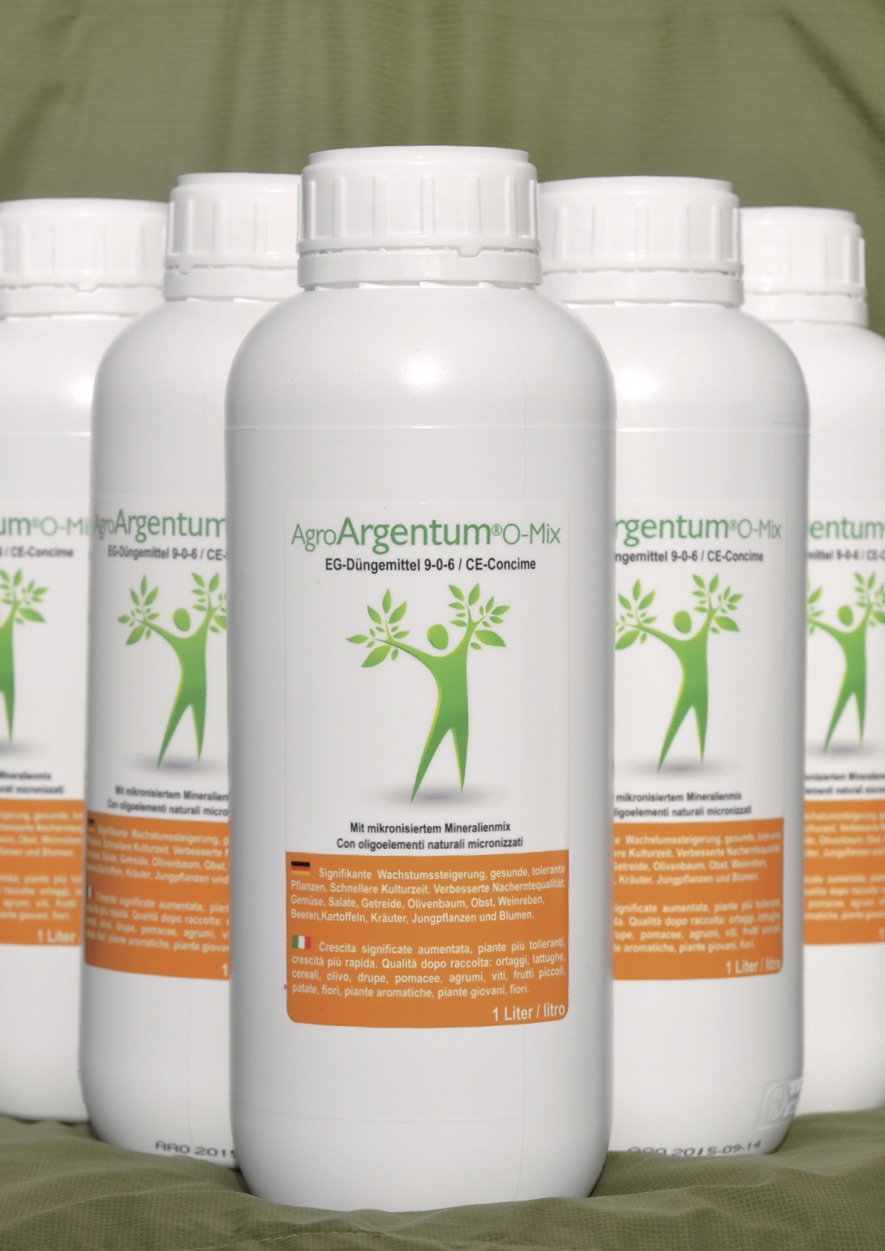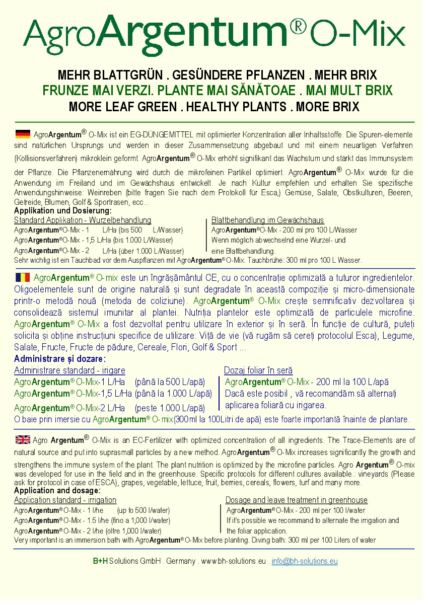 AgroArgentum® O-Mix este un fertilizator-EC cu o concetrație optimă a tuturor ingredientelor. Oligoelementele provin din sursă naturală şi sunt convertite printr-o metodă nouă în particule minuscule. AgroArgentum®O-Mix sporeşte creşterea şi întăreşte sistemul imunitar al plantei. Nutriția plantei este optimizată prin intermediul particulelor microfine. AgroArgentum®O-Mix a fost conceput pentru plantațiile în aer liber cât şi în sere. Sunt disponibile protocoale pentru diferite culturi : viță de vie ( protocol la cerere pentru ESCA), struguri, legume, fructe, cereal, flori , gazon şi multe altele.